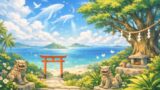 青石畳(あおいしだたみ)と呼ばれる雨に濡れた参道を歩くと、静寂の中に波の音と、どこからともなく聞こえる神楽の音色が重なり合います。